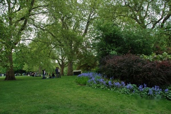 离开白金汉宫往北,沿着林荫大道前行,右手边就是美丽的詹姆斯公园。它位于白金汉宫和政府机构白厅之间,是伦敦市中心最大块的绿地。这个昔日的皇家猎苑是今天伦敦市民最爱。大片大片修剪平整的草地上,人们或晒太阳,或看书,或带着孩子玩耍,园中大树参天,鲜花五彩缤纷,河中的野鸭自由自在地游来游去。