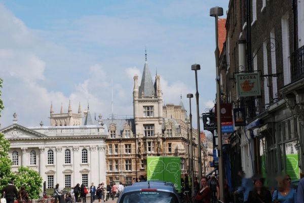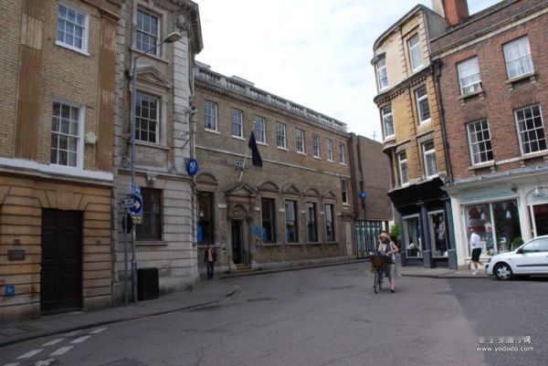 剑桥街上十分安静。没有大城市的喧哗,非常适合于学习和研究。自行车是最普遍的交通工具。许多老教授,戴着头盔,夹着裤管,骑着自行车,穿行街头。