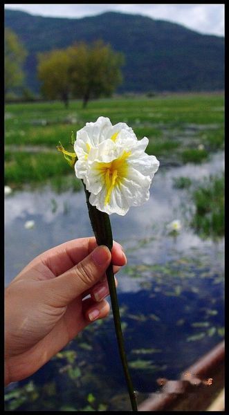 我们租了条小船在湖中撑了一圈,近距离接触了一下这片草海。除了水草以外见的最多的是乒乓球大小的田螺和一种白色小花。那是一种茎长1米多却没有根和叶子的白花,茎完全没在水下,只有花朵浮在水面上,象是撒在湖里的。船夫小伙子说它叫“水性扬花”,好个妖艳的名字。