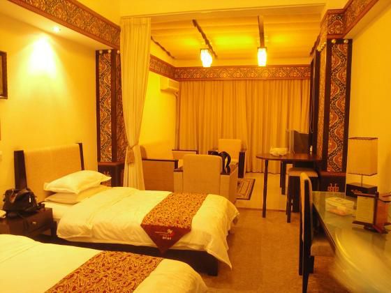 终于要去向往以久的九寨沟了,因为可以用老公的机票里程数换两张往返九寨沟的机票,所以选择了自由行。去之前在网上搜了很多关于九寨沟的攻略,听说现金买门票要排很久的队,故在网上订了门票和在携程订了第一晚上的宾馆(金珠林卡宾馆)。这是我们第一晚上住的房间。藏式的装修,很漂亮,也很宽敞,摆沙发那儿顶上还可以打开,是个阳光房呢,不过有点贵,决定明晚不住这儿了,找一个便宜一点的住就行了。