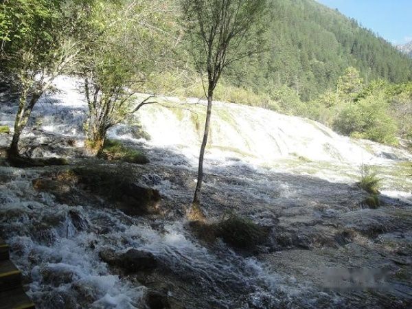 沿着木制的栈道,听着潺潺的流水声,走在安静的路上,感觉太兴奋了。听着水声渐渐变大,哇!忍不住惊呼,眼前水顺着山势向下流,水花冲击在石头上,溅起的水花全是白色的,好象一大遍全是白色的珍珠,心想这肯定就是珍珠滩了。