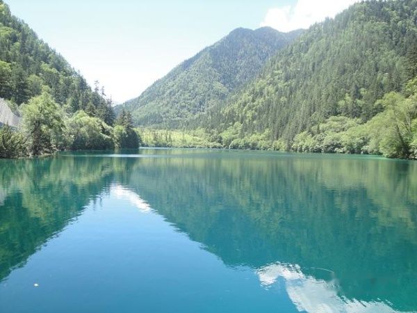 不知不觉就到了据说是九寨沟最漂亮的景点之一的五花海,深深浅浅的绿色,蓝色,以及天上的蓝天,白云形成了名符其实的五花海。要看五花海的全景,必须到一个叫老虎嘴的地方,但是景区交通车居然不在老虎嘴停,为了要看全景,不留下遗憾,只好顶着烈日走了近一公里的路,虽说九寨沟的温度不高,不过他的日照还是挺强的,在太阳底下晒着还是很热。不过回去的时候运气挺好,景区的巡逻车看到我们在烈日下走,搭了我们一段。这就是五花海的全景了,据说在老虎嘴看五花海象一只羽毛丰满的开屏孔雀,儿子却说更像一只驼鸟,说右边这部分就像驼鸟的脚,呵呵,本来多美丽的孔雀,现在在儿子口中居然成了驼鸟。