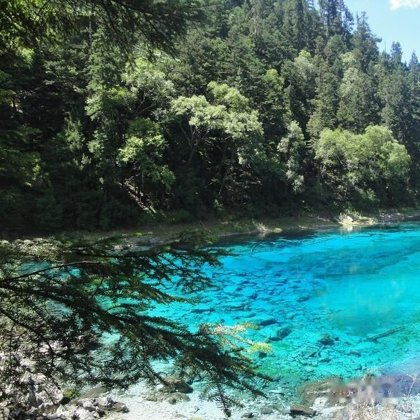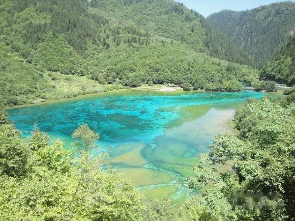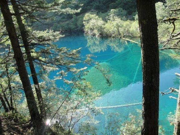 为了观赏到更多的美景,游树正沟我们还是选择走栈道,栈道上人很少,大部分选择了乘车,偶尔看到一两拨人,其余时间都是我们三人在栈道上走。 在栈道上看犀牛海,很漂亮,绿色的树,阳光照射下蓝色的海子。