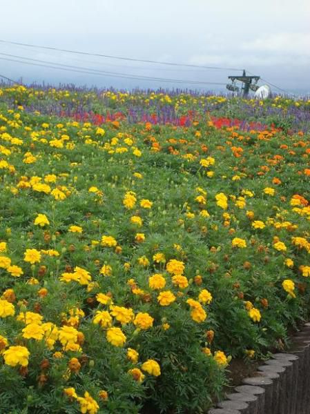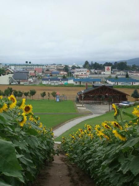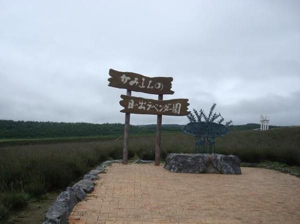 “上富良野 日之出薰衣草园”标牌。如果后面是盛开的紫色薰衣草就很美了。。看不到紫色花毯,残念。。。