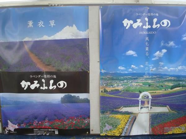 出租车司机大叔早已准时在外等候了,我一个人还流连忘返地恋恋不舍。。。据说大叔在车上猛看表,真是超级不好意思~(⊙o⊙)哦~!!!!一上车就赶紧说すみません~!!!抱歉抱歉~!大叔当然客气地回礼,然后又稳又快地把我们送回上富良野车站。这是上富良野车站上贴的海报,就是[爱之钟]在薰衣草盛开时节的美图,一片浪漫的紫色,真是很美。。。