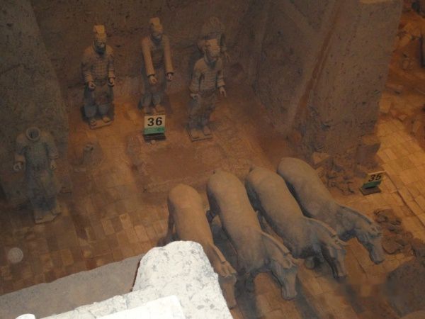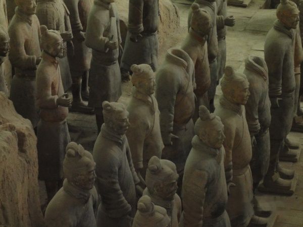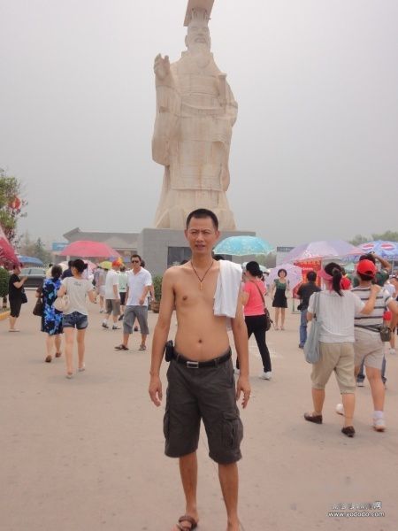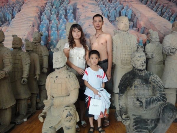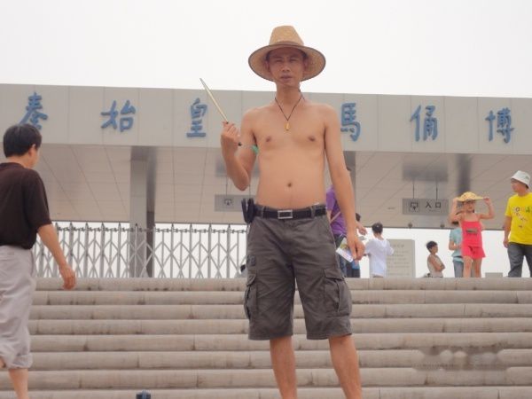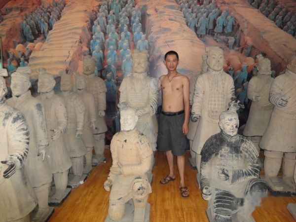 唉,西安真会利用游客对老祖宗的好奇心来忽悠,随便挖个地窖,摆几个木架就说是秦始皇的地宫来骗钱,地宫这个景点真的不值得去观看。出门后,那司机早就等在出口了,招呼上车之后就叫他直奔兵马俑,谁知道他开的车比牛车快不了多少,以为他是为了交通安全呢,谁知道他一脸的诉苦相:兄弟,帮帮忙,我们开出租车的都要把游客拉到当地的民政福利部门开的工艺品厂参观的,不管游客买不买,都会给一张油票,我收你那么低的价钱,就靠它来补贴了,帮帮忙吧?哈哈,狐狸尾巴终于露出来了,无奈上了贼船只好陪他走一趟了。只见他突然之间好像吃了伟哥那样把车开得飞快,到了地头还是老一套,摆几个假的兵马俑供游客拍照,然后就一大帮的导购拉住你进入销售大厅,被纠缠不过随意买了一个据说是蓝田玉的小玩儿,开价1380,砍价成400大洋成交。出了门口就想这的士司机肯定得提成的,不然哪会笑眯眯的守候在车里,放大空调的在等?上车之后怕误时间就催促直奔兵马俑。在一条两旁都是假兵马俑的公路旁停了车,下车就可以看到一个大广场,广场尽头立着一具人型大石雕,旁边别人的导游说这就是根据史料刻出来的秦始皇像,雕像上的人物确实气度非凡,两眼不怒而威,真的有一种君临天下的气势!抱着偶像的腿就拍了几张照--呵呵。这地方也太多鬼佬了,起码有一半的鬼佬陪着我们排队买门票(每人90大洋),一边是多加15快的直达观光车,一边是我们选择的不要钱11路步行街。一路走过看过路旁的旅游摊点不语,过安捡,入得兵马俑1号大厅,嘿,好壮观好宏伟啊,整个大厅怕有一千多平方吧,全部用钢梁担空,两旁的铁栏都围满观众,地下挖出很多的地沟,地沟里摆放着数量不等的兵马俑,有完整的有缺头少腿的,有马匹有兵器,也有两手空空的兵俑,但个个兵俑都非常健壮,一付赴汤蹈火,视死如归的样子,整个场面气势恢宏,壮观。可以想像得出来当年秦始皇一声令下,千军万马,如虎狼一般杀灭六国。有如此的军队,谁敢与争锋?