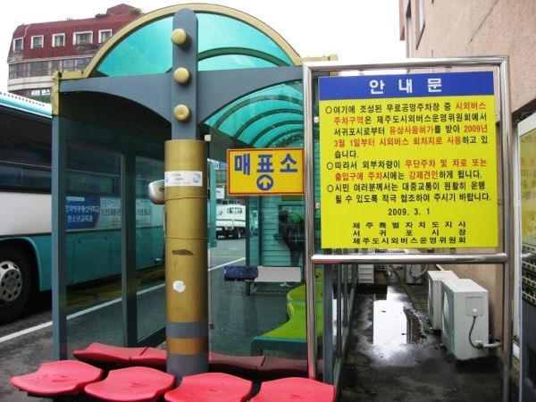 从宾馆出来经过600路车站再往前一个路口右转,一直走下去就会看到汽车站了,还是比较好找的。从西归浦到城山需要1个小时的时间,车票3000韩元。上车之后拿着地图指给他看,他就会在城山给你停车,并告诉你从哪个路口下去怎么走。路上也会有指示标,不会迷路。(不过首先你最好认识一下景点的韩语写法,这样才能辨认。我的方法就是把中文跟韩文对照着写在一起,更方便问路)