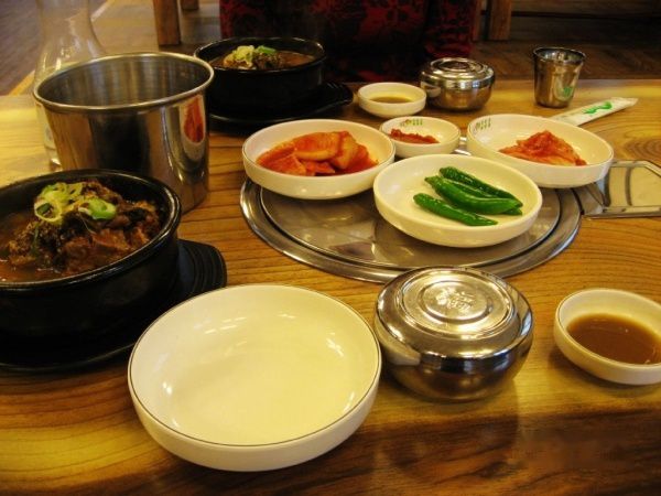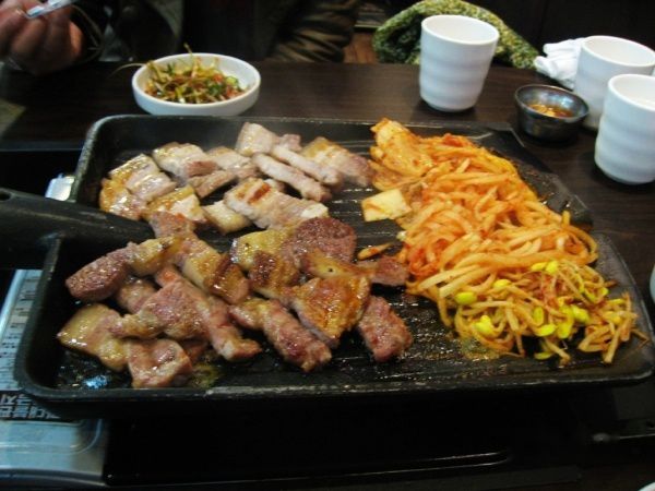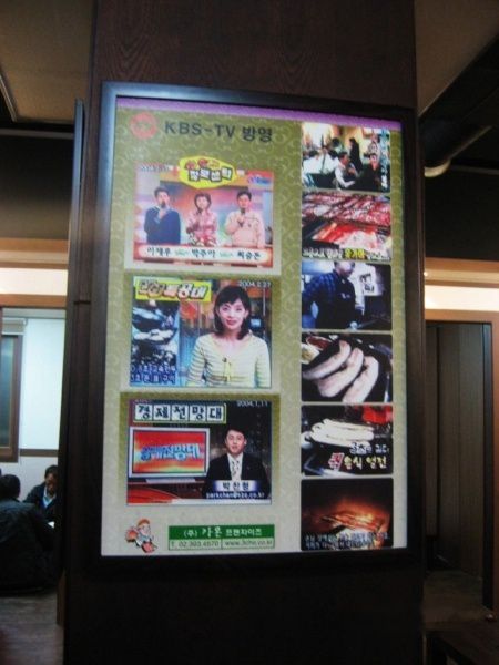 到了终点西归浦市外汽车站,就走进车站旁边的一家铁锹烤肉店,这里是我早上出发的时候看到的,门口一个大大的铁锹甚是抢眼。本来打算去济州吃网上很多人都推荐的那个烤肉,可是还要在返回西归浦觉得太麻烦,所以就在西归浦找一家吃一下好了。进门之后发现里面空间很大,也都是韩国传统的热炕头。席地而坐,服务员端上来一壶开水,可惜是凉的。我用英语告诉她要热水,可是她一脸茫然,看样子不懂英语。而我又不知道韩语热水怎么说,只能用肢体语言来表达,还好我的表达恰当,她一下就看懂了,马上为我端来了热水。这家店跟我之前吃的几家不同,他们有菜单(之前吃的小店都没有菜单),虽然看不懂可是有图片参考,为了都品尝一下,我点了两个不同的烤肉(应该是猪的不同部位吧)。就着烧酒,用菜叶包上五花肉,哇,太好吃了!!!比国内的好吃很多,肉大味香,不同于国内的薄薄一片。酒足饭饱,在旁边的柱子上看到了一个大的KT板,上边是电视报道的资料,原来他家还上过电视呢,看来瞎蒙还蒙对了。