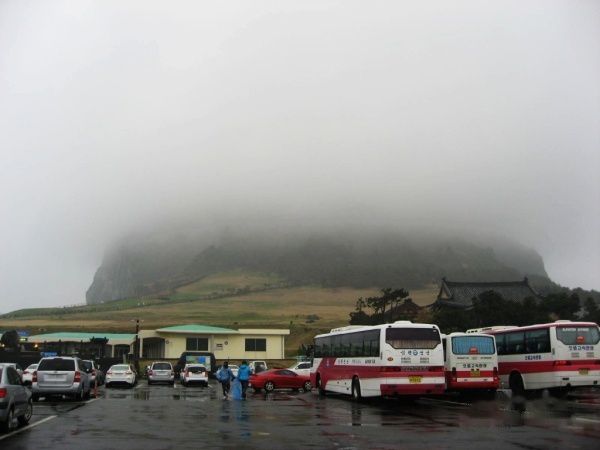 日出峰下有一家小店,其实说小也不小,他家的骨头汤非常好喝,可能是我喜欢的口味吧。不知道是因为太好喝还是因为早上没吃饭,我竟然吃了两碗米饭(狂汗@!@),结果也只花了5000韩元。喂饱了肚子,出发去日出峰。因为下雨雾气很大,在日出峰下只看到日出峰一半隐藏在云雾之中,很壮观。本打算买了雨衣上山的,可巧在山下遇到了一个卖橘子的大姐,她竟然是中国的朝鲜族,在那边生活。跟她攀谈了几句,最后觉得上山也是什么都看不到,不如不上。所以只是在山下拍了几张照片,就出发去游客码头坐船去牛岛。