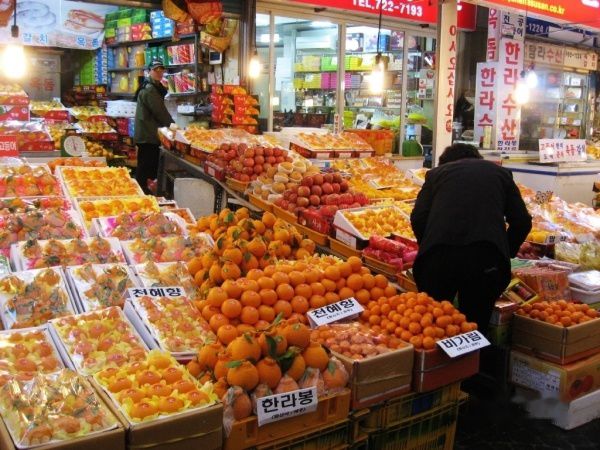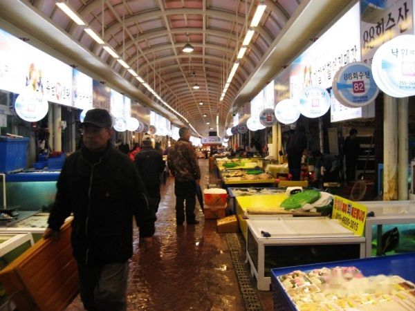 从宾馆出来还没到车站就看到600路从身边驶过,于是拉着行李小跑起来,还好司机一直等着我,上车直奔机场。到了机场将行李寄存起来(寄存费3000韩元),因为我是下午2点多的飞机,我打算利用上午的时间去东门市场和中央地下商场逛逛。为了节省时间打车前往,到达东门市场用了不到10分钟,车费3600韩元。其实东门市场好像我们的大集市一样,在一个大棚子里面。有海鲜区、泡菜区、水果区,品种很多,泡菜看着就好吃,可是怕不好拿所以没有购买,只买了一大袋海苔花了3000韩元、兩盒夹心巧克力花了9000韩元(可以讲价的呦!)。在旁边的一个超市买了几盒当地的咖啡和韩国大酱(应该比国内的大酱做酱汤更正宗吧)等零七零八的东西花了40000韩元,还算可以。