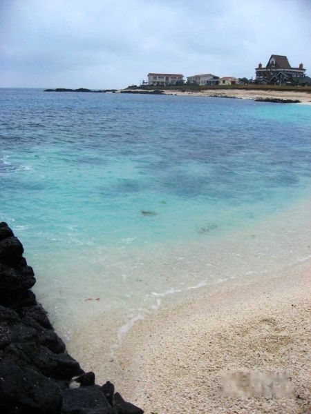 上岛之后就有很多的旅游车,他们会带你游玩岛上的主要景点,价格为5000韩元。司机也会在沿途介绍景点,可惜都是韩语,完全是鸡对鸭讲。不过还好同车有一位热心的韩国大姐,她热心的招呼我跟他们一起走。去了白沙滩、牧场之类的地方,景色还不是很好,毕竟还没到油菜花开的季节,否则满山坡的油菜花该是多么漂亮呀!这里也是韩剧的一个拍摄地点。站在山头望着远处的大海心情非常的愉悦。白沙滩很漂亮,白色的沙子、黑色的礁石、碧蓝的海水,好似一幅画,所以济州岛也被称为韩国的夏威夷。我准备过一段时间再去一次,住在牛岛上,感受这美丽的海滨浴场。