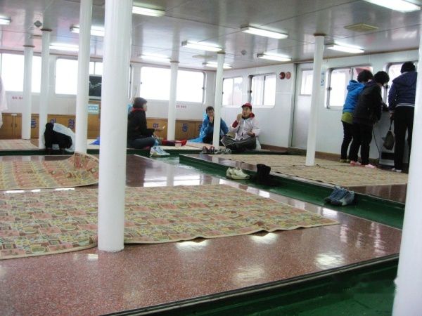 日出峰出来会看到汽车站,坐车2站就到,花费1000元,不过下车之后还需要走一段到码头。买了往返的船票,花了5500元(买票时需要填写一个单子,都是简单的信息)。从码头到牛岛只需要10分钟左右,行程中海鸥在船的周围飞来飞去,非常好玩,偶尔还有人抛食物到空中,它们也能接住。船舱内不似我们国内的船是座位,他们内部都是炕,上边铺一个垫子,大家都是脱了鞋上去坐,这是韩国的特色吧。