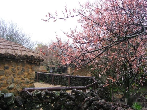 从牛岛回来在码头附近坐公交车去济州民俗博物馆,这里是大长今的主要外景地。公交车是开往西归浦的也就是我早上坐来日出峰的那趟路线(车费1000韩元),司机在路口停下告诉我在前边的路口左转。虽然我按照司机的指引一路走下来,可是在岔路口还是有点晕,于是打听旁边餐馆的老板,他人很热情会英语,特意出来给我指路,我也在他的指引下顺利的找到了这个博物馆。门票7000韩元。其实里面就是各种茅屋,好像一个小村落。因为下雨,所以没有穿上韩服照相,有点可惜。茅屋旁的油菜花开了不少,跟樱花交相呼应,煞是好看。如果到了3月底4月初,一定更漂亮!雨越下越大,裤子被淋湿了不少,风一吹有点冷。所以草草的游览了一下就坐车返回西归浦(仍然在下车的地方等车,车票2000韩元)。
