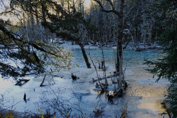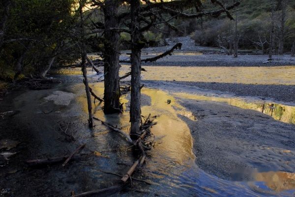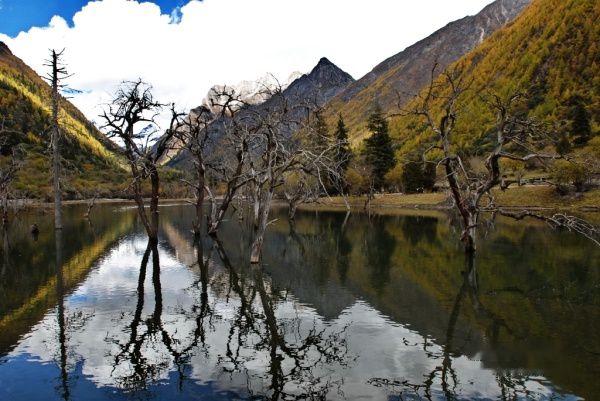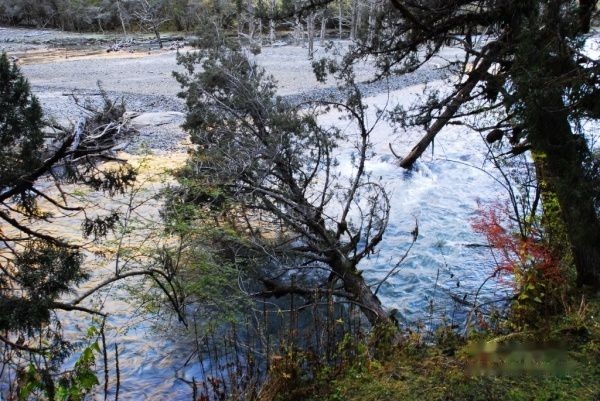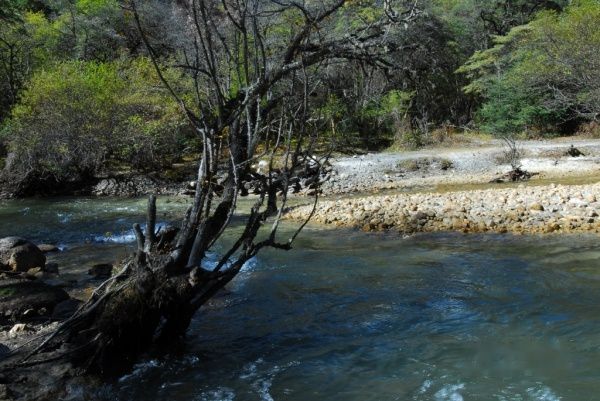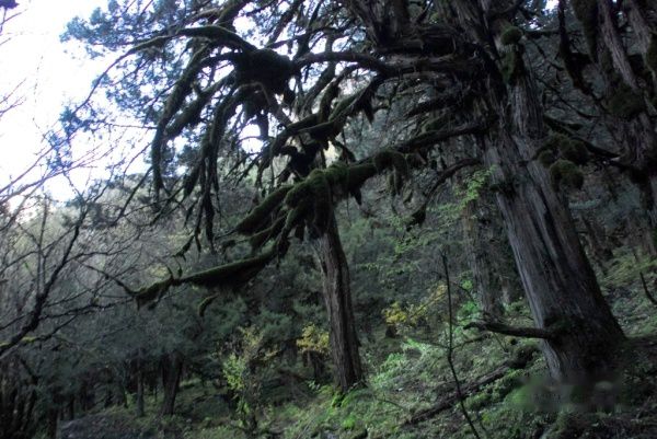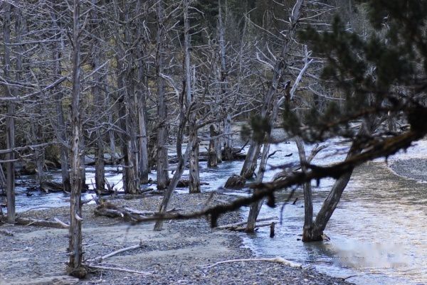 海拔3470米,面积约1200平方米。柏树,杉树因雪水冲积枯死而自然形成,树木盘根错节,枝条曲伸有致,构成一种原始的凌乱美。