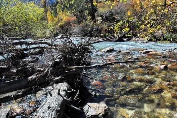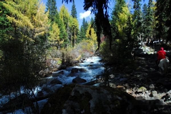 路很难走如果还能叫路的话。马能走得路牵马的人确走不了,他要离马远远的另挑“路”走。马儿认识路,不用牵马人带路。在头马的带领下四匹马鱼贯而行,骑在马上,环视四周,一片原始生态的森林,溪水,五彩斑斓的景色,真是美不胜收。骑在马上不时举起相机捕捉美景。