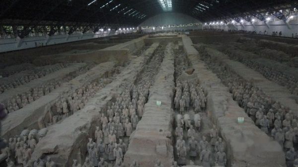 坐车到火车站,坐上游5,没几分钟就发车去了兵马俑(坐满即发,很方便,7块,ps陕西的公交基本都1块)。兵马俑又是个悲剧,我们在停车场下了车,沿着上山的道道亦步亦趋的(雨下得大)走到门口,得知在山下买票,心儿拔凉拔凉的。然后又下山去买票,学生票45,然后再亦步亦趋的爬上山,检票入内。门口都是导游,45块钱一个;话说我们都是到处蹭导游的人,就跳过跳过,在善良的导游(虽然我们没请,仍然)指导我们走对第一步。进去,真是到处都是导游,左听听,右听听,有些导游讲得好有些就一般般,大家就自己品评。我们在第二展厅就遇到一个很会扯的导游,幽默风趣,于是一直跟着他到最后,还和他互动,很囧吧。兵马俑是传说中西安必去的经点之一,又有三分文物七分解说之讲,蹭个好导游是十分必要的