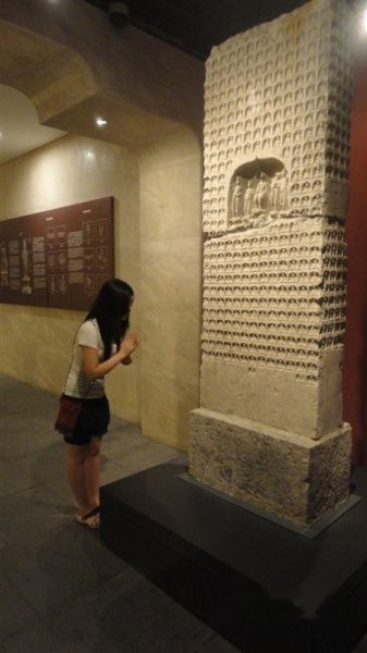 走完碑林差不多1点了,我们横着一走,走到一个不记得名字的纪念馆,很是不错,里面各种佛塑,在昏暗的莲花灯下显得庄严神秘,也许大家看完碑林就走了,所以里面只有寥寥几个游客,貌似,就我们几个&保安,难不成又包场啦?那是还觉得有点赶时间,所以看得飞快,冷落了头身分离的各位佛身,其实那些雕塑也很值得一看,非常美貌,似乎比陕博里的那些个佛塑更摄人心魂,也许是因为里面神秘空旷的氛围才使得我有这种感觉吧。