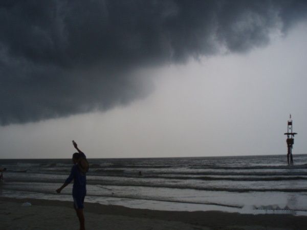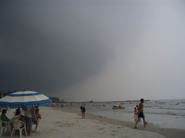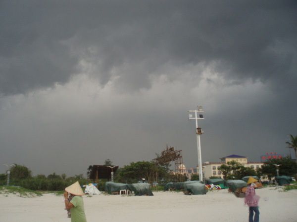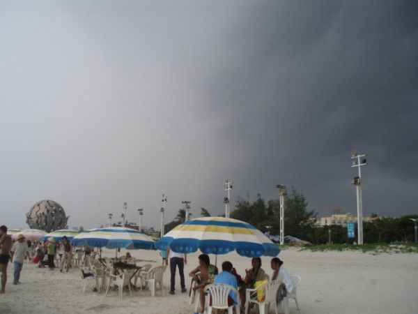 正睡得舒服的时候,突然听他们叫我,我一个翻身就爬了起来,惹得他们哈哈大笑,笑我反应快。回头一看,原来是涨潮了,刚才如果我没起来的话,肯定全身都要被海水打湿了。先躺下时,我们离海水还挺远的,不知不觉海水就漫过来了,我们赶紧和老板将桌椅又往高处搬。桌椅才摆好没多久,天突然变了,感觉马上就要有大暴雨来了,海滩的护卫赶紧催海里戏水的人上岸,叫海滩上游玩的人赶紧离开,于是我们匆匆收拾起东西离开海滩。不过离开海滩后,预期的大暴雨并没有下,只下了一小会儿的阵雨,太就放亮了。