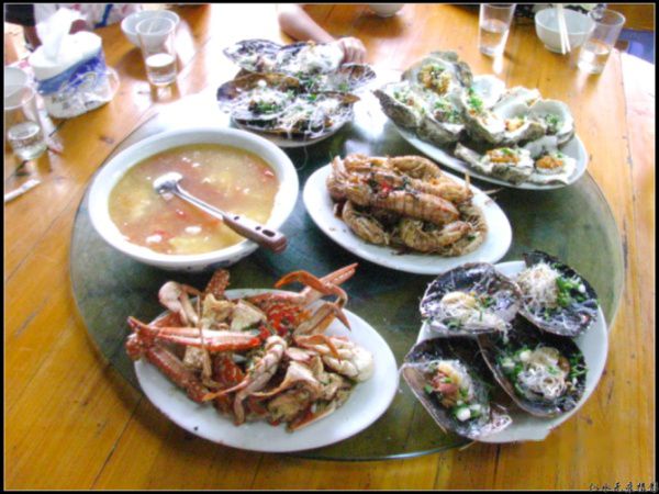 中午我们就在海滩边找了家大排挡,整了几个海鲜“腐败”了一下,这里的海鲜确实便宜,赖尿虾20元/斤、花蟹35元/斤、石斑60元/斤、生蚝11/斤、大带子7元/个。不过素菜就有点贵了,每样都是15元。好在老板弄的海鲜味道还不错,大家吃得都高兴。