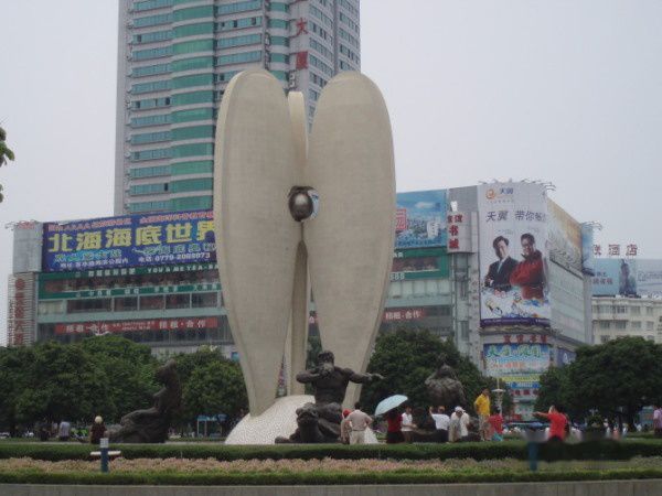 来北海之前在网上查了北海的北部湾广场的住宿好找又便宜,于是船到北海后,我们一出国际客运码头就坐上到北部湾广场的空调大巴(每人2元)。没多远就到了,下车的地方就是北海有名的北部湾广场。