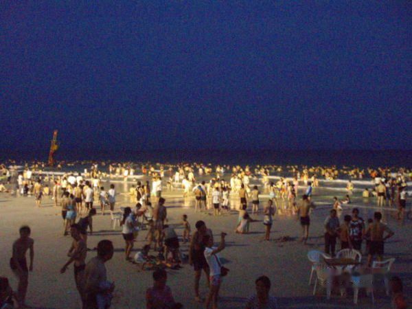 大家大饱口福后,坐3路公交车到了北海的银滩公园。 银滩公园是免费供游客观娱乐的天然海滨浴场。浴场面积16万平方米,可同时容纳1万人以上入水游泳。晚上到银滩游水的人很多,我身体不好,不敢下水,于是在海滩边铺上防潮垫美美的睡了一觉。