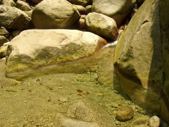 这是山涧中的溪流,我迫不及待地用它洗掉了遗留的防晒霜,水清凉,我有冲动想要脱衣进去洗澡~最终理智还是占上风的,洗洗脸就很舒服了...人家下游的住家还要喝呢。就在此时一只袜子漂了过来,我在心里骂了一句#@¥!