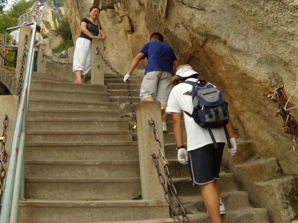 一上卧牛台附近人一下就多起来了,大多是坐索道上来的,还有准备下山的,有一姐姐还穿的是高跟鞋,我的崇敬之情即如滔滔江水...... 从卧牛台到金锁关大概是华山上最繁荣的地界,卖锁的买吃的买玩意的~还有端着单反给人照相的,那相机好啊尼康的.....我什么时候也能端一个呀......