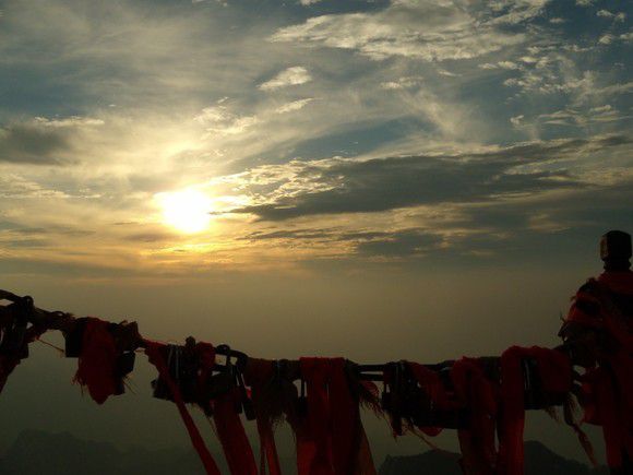 西峰~视野开阔了。看景的时候心无杂念,这景就纯粹了。总有人问爬到高峰是不是有种成就感?不是,没有所谓征服的感觉,只是觉得自己和这山近了,熟识了。抬眼看看,这里还不是峰顶。先去把住宿办妥吧。在一个摊位上买了一瓶蜜茶,10块(今天买的最失败的饮料——太甜了!)。问了气象台招待所位置,寻了去。很失望....太暗,不喜欢。又走回买蜜茶的地方,翠云宫里就是西峰宾馆。强烈推荐西峰宾馆的9人间,80一个床位,虽然不知道白色床品几天一换但至少视觉上觉得安心....不要指望有冲水厕所和淋浴间,宾馆的服务员都是半个月下山洗一次澡的....而且不要浪费水,山上的开水都是雨水煮的。我花了半个多小时才接受了山上不能洗澡这个现实,用毛巾接了水简单地擦了擦肩背僚作安慰。再磨叽了一会儿,快七点了,带了相机去莲花峰看日落。由翠云宫上到莲花峰攀铁链上最快。一块3米高的石壁上垂着一条铁链还凿了几个石窝,正在我犹豫着上还是不上时,一队老外杀了过来,二话不说攀了链子就爬上去了....好像挺容易的,那我也上。