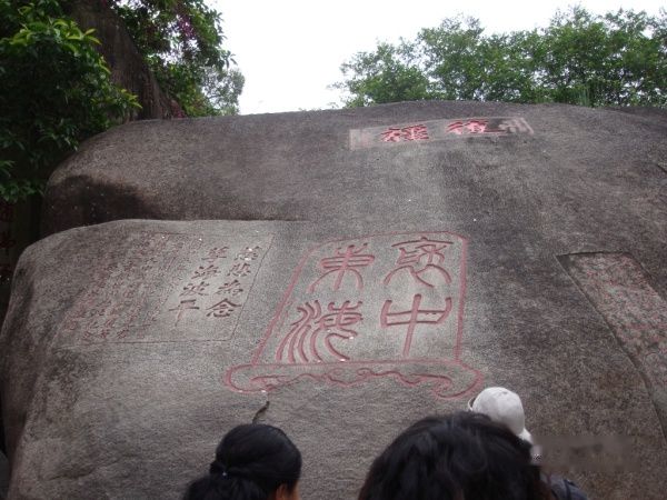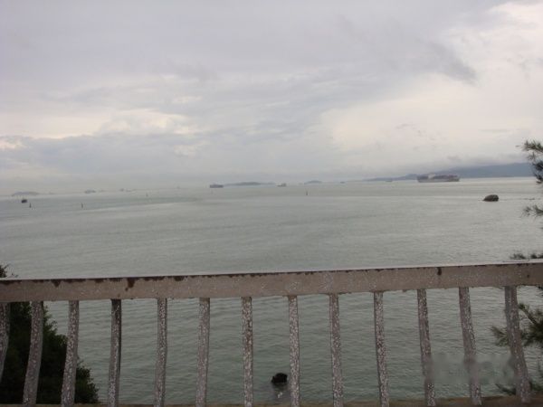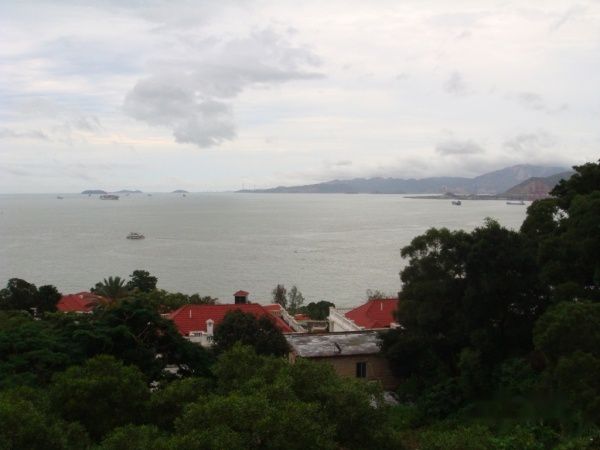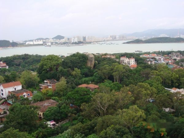 下了索道,就到了日光岩,是鼓浪屿上最高的一块石头。我们随着**拾阶而上,有些陡。转了几圈,我们站上了鼓浪屿的最高点,位置很小,勉强站上10个人,风很大,有雨点滴下很是凉爽。眺望整个鼓浪屿,入目的都是绿绿葱葱,偶有几点红色的房屋在树木中隐现。看看前方的海滩,今天有几艘海艇在海岸线的飘荡,很难理解,海水上漂浮着很多杂物,却还有人坐着海艇漂浮在这片海水上。