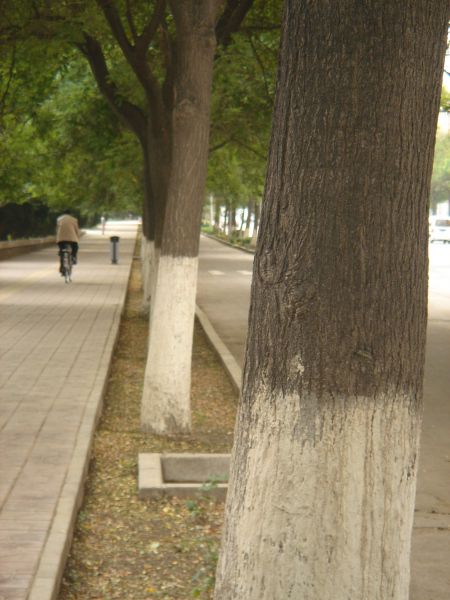 兰州的街道,还是比较干净的。特别走在黄河滨(滨河南路)让我有种70年代清净小城的感觉——适意。这条街道的行道树,根部都没有用现代的水泥浆、水泥板封死,就让泥土那么敞开着——树根呼吸一定通畅。落下的树叶,铺陈在黑色的泥土上,那么的自然,那么的恬淡,那么的和谐。看了让人动容,让人熨帖。