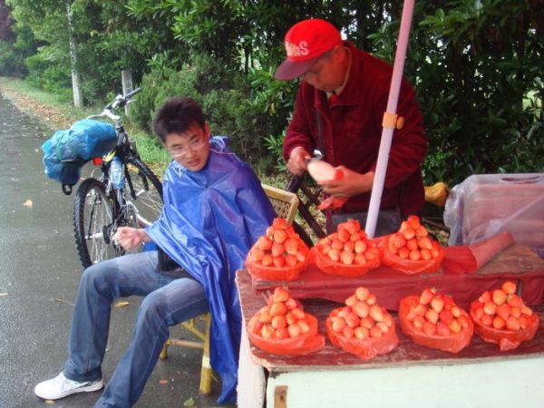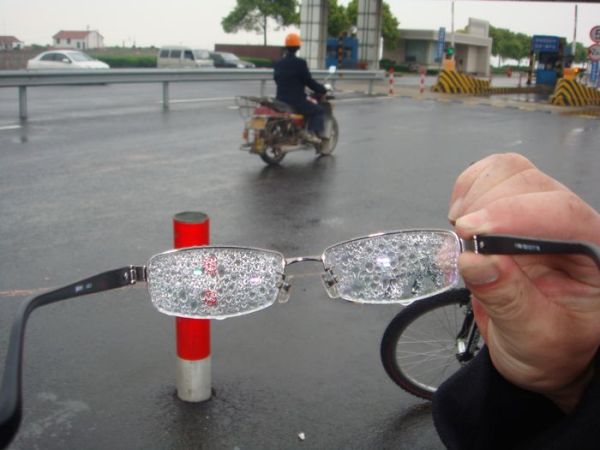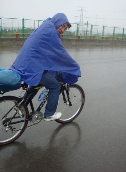 雨中骑行是这样一个状态,裹着雨衣前行,不一会雨衣上的凹陷处就会形成一个个小水塘。最要命的是没有多久鞋子里外全湿,很重很难受,真不是一种好感觉。春子同学比我还郁闷,由于戴着眼镜,不一会眼镜上就全是水珠,只能迷糊着看着路。