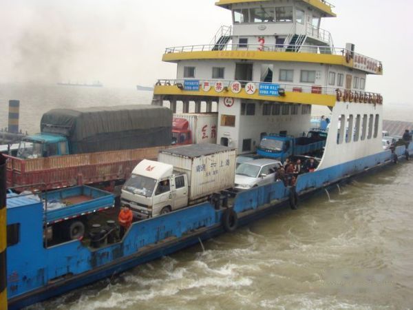给船来一张特写。船上下面是装车的,人都在二层上面。