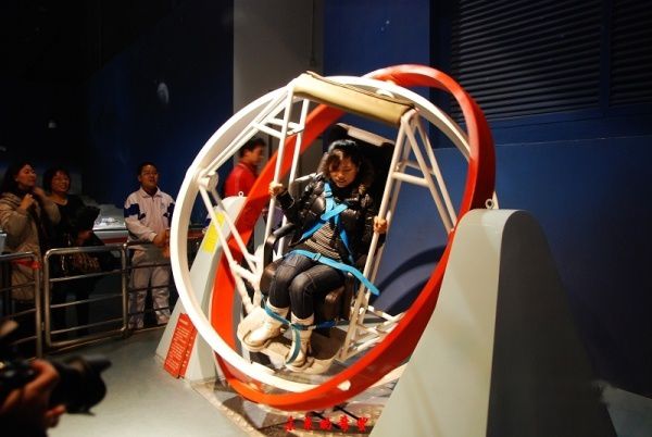 小学生们都对气流推进体验很感兴趣,使劲蹬动脚蹬,后面的风扇旋转产生的推力可以使自己前进,于是排队等候,每人可以蹬转2圈。