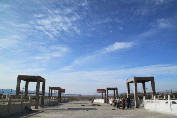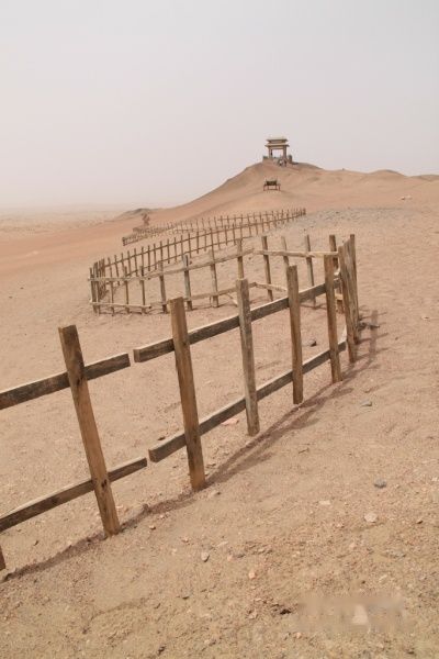 在这里坐了电瓶车去看阳关故址和烽遂。阳关故址已经什么都不剩了,只能立个石碑以兹纪念。后面那一片乱石滩就是著名的“古董滩”。中间有一条弯弯曲曲的栅栏隔着,隔栏远眺,真的是一望无际。
