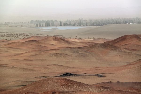 爬上那个亭子,可以看到不远处的碧蓝的水库和隐隐的绿色,在这一片荒芜中能看到一丝绿林水色,不免让人心情为之一振,虽然那天依旧是灰蒙蒙的天空。