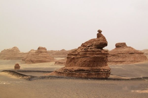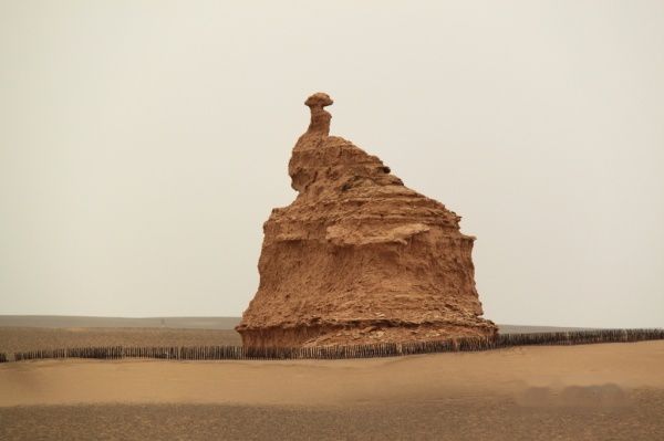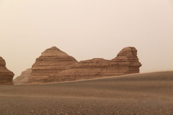 离开玉门关继续前往雅丹地质公园。去的路上,竟然飘起了零星小雨,掺着空气中飘浮的沙尘,毫不客气的在衣服上打出点点“黄花”。跟着景区的大巴进入雅丹地貌,雨是停了,但狂风开始肆虐,车窗外一片飞沙走石,原本黑色的戈壁上被吹得浮起了一层黄沙。下车的时候狂风卷着沙石打在背上啪啪作响,背风走路几乎是被风吹得飘着跑的。如此恶劣的气候条件下在雅丹穿行,也算一种别样的体验吧。