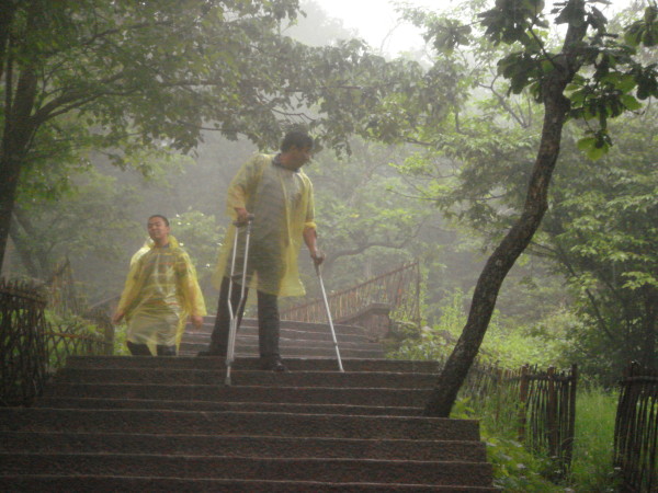 我们虽说是上山,但黄山不同,它是一会上一会下,阶梯还很不规则,又逢下雨,真的很累人。我们走走停停,要不就是听导游讲讲景点。黄山真的没什么,就是一些松树:黑虎松(说曾经有老虎趴在树顶上)孔雀松(树长的像开屏的孔雀)龙爪松(树根长得像爪子并且露出地面)-------我没有放些相应的照片,一来我拍得不好,都是朦胧的,二来有兴趣的人可以自己查到它们的图片,如果你看了这些黄山景点的图片,大概就不用去黄山了。去黄山无非就是爬阶梯,上上下下,看些松,怪石,没什么意思。让我更失望的是:因为下雨,很多景色都没看到,例如:飞来石。事后我在宾馆里看着用1元买来的黄山市旅游图,说了这样一些话:黄山,就是很多峰的集合:眉毛峰,佛掌峰,莲花峰------无非就是智慧的人利用了想象能力,再告诉一些不愿想象的人,这是什么什么,像什么,传说什么什么------黄山的景点例如仙人翻桌,双猫捕鼠------很多很多都是靠想象的,拿来主义的人就听导游的,看懂就行,双猫捕鼠就是双猫捕鼠,不会是双狗捕猫。会有人说我们哪里有那么多的时间想象呀,旅游就是走马观花,看看玩玩。我一直想找到旅游的意义,这次去黄山,我依旧没想通,这么多的人热衷旅游是为了什么,就为看几棵长得奇怪的松,几个怪石,瀑布?为了享受一路和家人,和同学的时光,我们一路上可以说说笑笑,可以为同一个目标而努力,可以感受大自然的气息并且暂时逃开城市的繁华,回归自然 是我暂时想到的旅行的意义,可能随我的阅历越来越多我会更加理解旅游的意义。原来准备走下山的,但我对黄山实在是没什么兴趣了,我索性和爸妈坐索道下山了。我曾对我爸妈说:我是黄山归来不看山,但我错了,因为我们中国好些美丽的风景还是在山上,我们得趁年轻有那个精力游遍祖国的大好山川。至于对黄山印象不好可能是一路没看到什么令自己满意的风光,就连到了海拔1860的光明顶,都不能一览众山小(因为下雨,雾大,什么都看不清)还有这次只用了1天不到的时间玩黄山是太仓促的,想想徐霞客用十几天的时间游览黄山呢,真是一份耕耘一份收获。