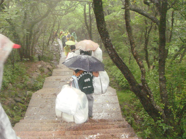 山上的东西都是这些挑夫一步一步的挑上去的。