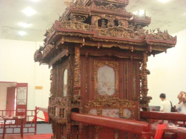 轿子虽是很豪华,但新娘却是不幸的,这轿子背后有个凄凉的故事,我就不从传说多少年前讲起了。这顶轿子让我想到杂志上刊登说不少嫁入豪门的女人都是表面风光,其实她们背后是受到很多豪门的委屈呢,我又一次肯定了:财富和幸福不是成正比的。我好想像古代的女子那样坐顶轿子出嫁,或许比坐轿车浪漫呢,哈哈。
