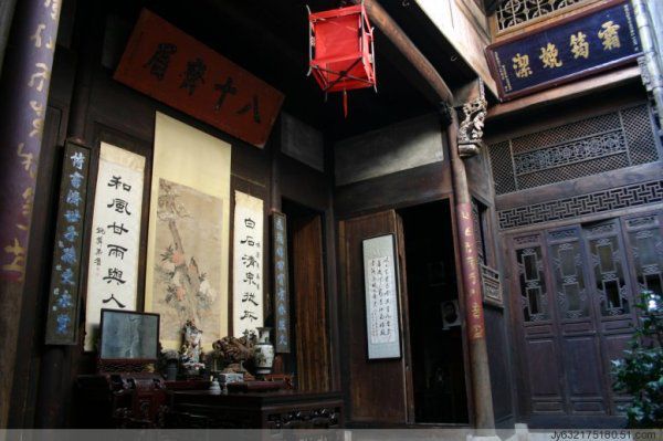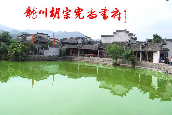一下车,沿着一汪碧水堤岸用鹅卵石铺就的弯曲通道,抵达府第门前一个用鹅卵石铺成的小坦。抬头一望,大门两侧一幅黑底金字的楹联“襄懋故居添异彩,龙川胜地出名流”。是袁瑞华老先生的手笔。走近府第门口,一块红底金字的匾额“徽州第一家”首先映入眼帘,导游小姐指着那池碧水向我讲述了一个“北斗七星潭底埋尚书府的第一特色”的典故。又指着对面山岚上的一排古松对我说:“那古松树冠的轮廓线正好勾勒出一幅”龙头风尾“的天然图画。其中一株迎客松鹤立鸡群、亭亭玉立,仿佛在向游客们招手致意,殷切欢迎。这是龙川这块风水宝地的龙脉、龙气之一。