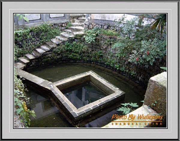 导游小姐把我带进了“惜月亭”,游览了“徽戏园”、“寒香园”和“梅林亭”。那“梅林亭”中有一口“胡氏家井”,井里绿水红鱼,令**连忘返。这口井外圆内方,井口的条石排列加上“月形”的井边恰好暗藏着一个“胡”字,又像是一枚铜钱。真乃匠心独运、奇思妙想。又是府中一特色!池边内侧一块条石上镌课着“清标彤管”四个红色楷字,倒映在绿水中,随波荡漾,泛起红色的水纹似与那红鲤同游,好一幅“碧水青波”的水彩画,别有一番风韵。