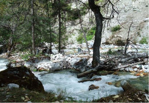 今天的目的地是五色海,那个传说中稻城亚丁最美丽的海子的地方,听当地藏民告诉我们,如果你一次就能看见稻城亚丁的三座神山,那么你就是一个有福之人,你便会得到神灵的庇佑,老天保佑,老天保佑,让我登上“诺亚方舟”吧。我们从早上7点就正式出发了(马帮的正式运行时间是7点30分),我们自己徒步上冲古寺吧,沿途的树林里不时串出一只或是两只小松鼠,好可爱,学妹叫我帮她抓一只,带回北京当宠物。淙淙的小溪就在我们左边,这可是神山流淌出的圣水,神山沁人静灵犀。