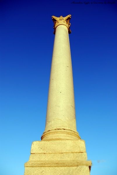 罗马皇帝戴克里先统治期间,驻守亚历山大的大将艾赫里叛乱,戴克里先亲率大军远征讨伐,围城8个月,残酷地进行镇压。当时城内饿殍遍地,瘟疫流行。戴克里先调来粮食,赈济灾民,安抚百姓。公元297年,埃及执政长官波思吐莫斯在赛拉比斯神庙的广场中央建立这根石柱,以示感恩戴德。柱基西侧石壁上刻有四行字,至今依稀可辨:“为战无不胜的亚历山大监护神,公正的戴克里先皇帝,波思吐莫斯谨立此柱”。