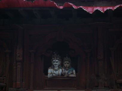 他们住在湿婆—巴瓦娣庙(Shiva Parbati Temple),这座寺也在杜巴广场,很小的一座庙,在二层中间有扇窗户开着,湿婆神和他的王妃巴瓦娣就从那个窗口探出头,湿婆留着小胡子,就是20世纪著名画家达利的那种翘着的胡子,很戏剧化,而巴瓦娣则衣着艳丽,与夫君站在一起,神态亲昵。他们是在观看楼下女神们跳舞,湿婆看得高兴,左手不知不觉就搂到了巴瓦娣的左胸,很生活化哦