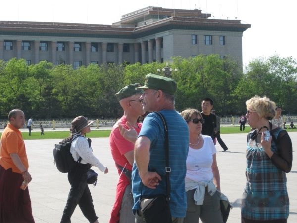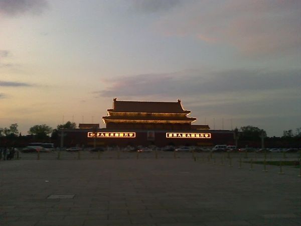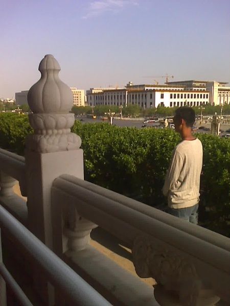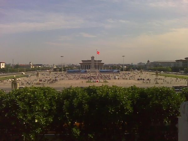 刚上天安门城楼,相机竟然没电了,只好动用手机,只是,它的内存实在太小了。天安门城楼全票15,学生证5元,有一个过期的,没敢用,心虚。这里不让带大包,要寄存。我的书包是3元,还好。