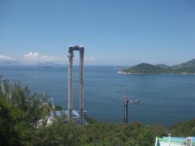 海洋公园里最恐怖的,应该就是极速之旅了(俗称跳楼机)。有60多米高,相当于而是几层楼。其它游乐项目排队老长老长,但是那个没有一个人玩,偶尔看到启动,都是放空的。其实我很想玩的,别说没人陪我,连给我壮胆的人都没有,想想,如果玩晕了玩吐了,扶我一下的人都没有,岂不是很可怜!还是别玩算了,留着下次吧。(在海洋公园一整天,就没看到一个人来玩的,都是成群结队的,除了我,又让我郁闷了一把。厚厚,你要在该多好啊,唉。。。)