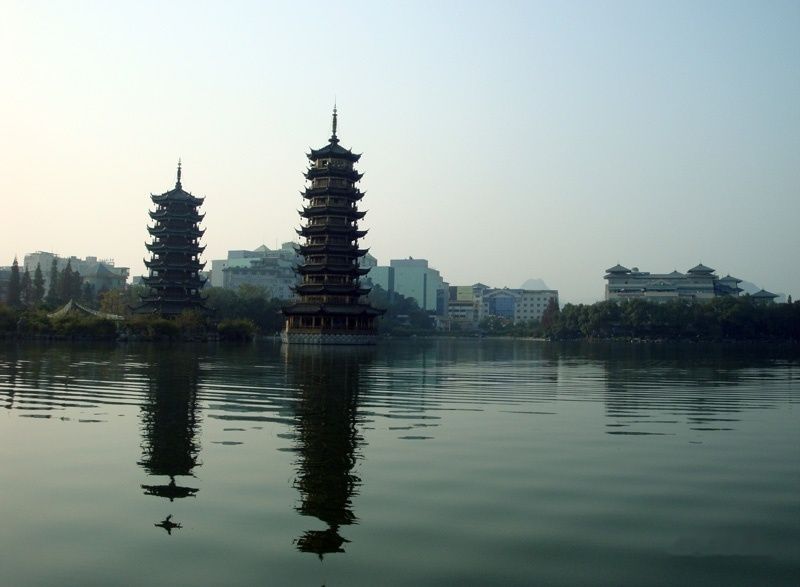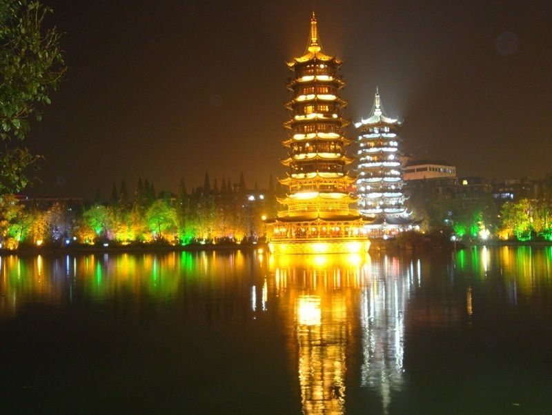 在广场边上的桂林人吃了碗金牌桂林米粉,看上去是比路边摊讲究了一些。一碗米粉,一份乳鸽炖汤吃得肚子有点撑,决定走路回酒店。穿过中心广场,到了榕湖边上,白天看到的双塔这时候已经灯火璀璨,用夜景模式拍完后,相机没电了。在湖边坐了半天,决定回酒店。
