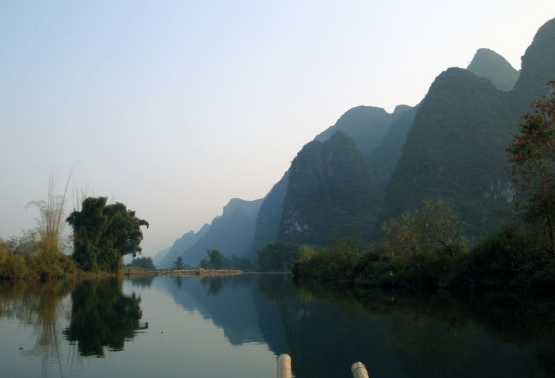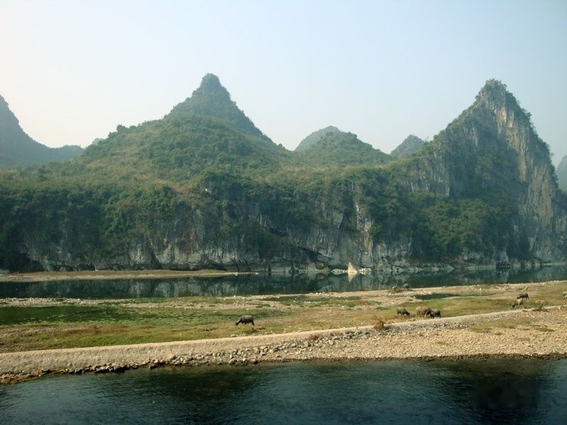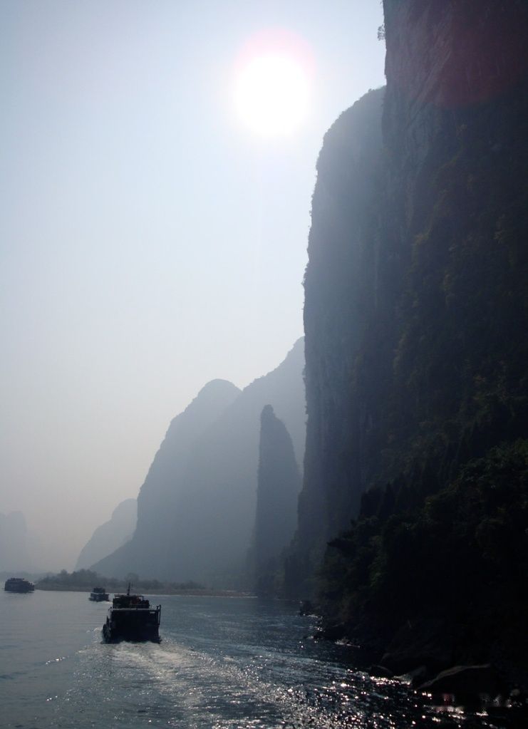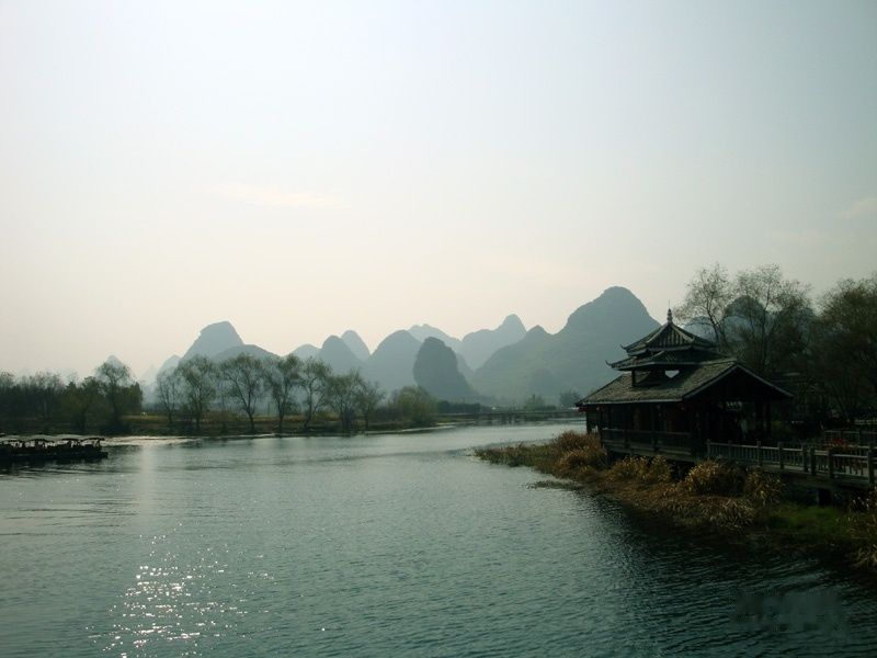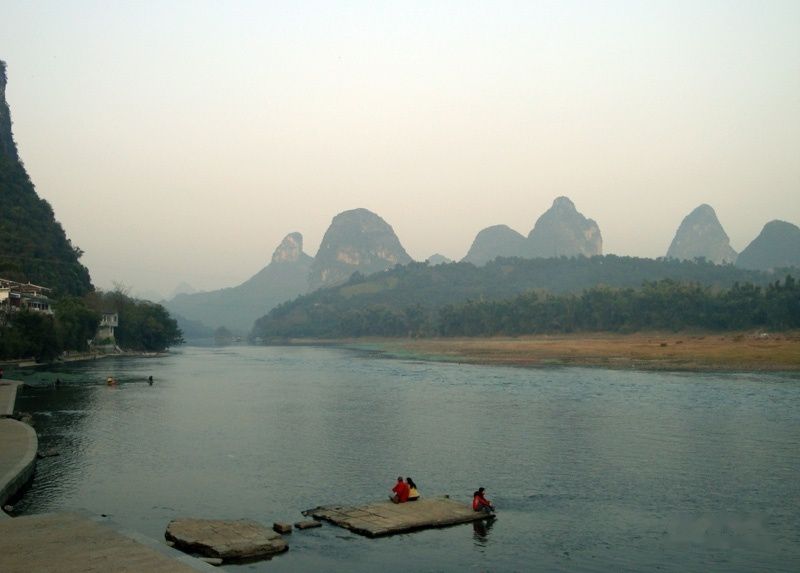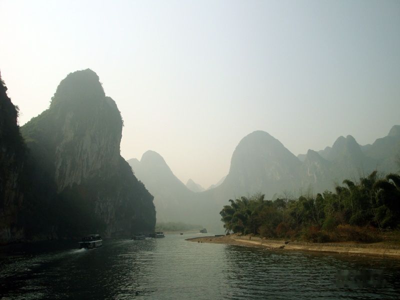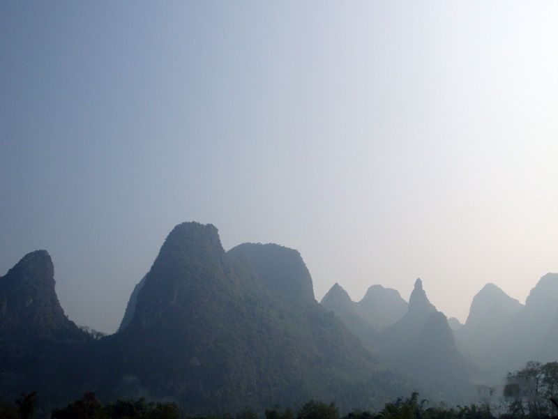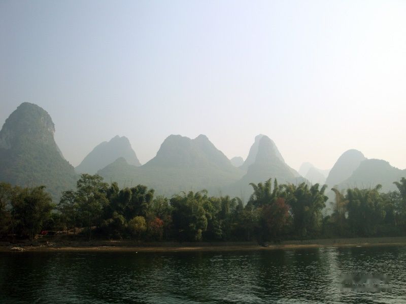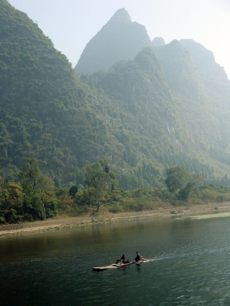 因为功课不充分,所以只订了酒店和机票,其它的门票之类的都没有在携程订。后来发现,有些还是应该在ctrip订的,还能稍微省点钱,比如漓江船票。在酒店订了第二天游漓江的船票,加上酒店接送码头的费用,最低也要225,真是够黑的。从桂林到漓江水路大概4个小时,走公路大概1小时,价格差的可不是4倍阿,都到10倍了。不过漓江的景色真是美啊,虽然天气不算很好,远景都是雾蒙蒙的,可是还是忍不住拿起相机猛拍一通,基本上除了中间吃饭,都是在顶上的甲板欣赏美景。江边山峦叠嶂,连绵起伏,形态各异,想象力丰富的人不难想象出一幕幕的场景,可惜我的发散思维差了点,连著名的九马画山也只看出了两三匹马而已。