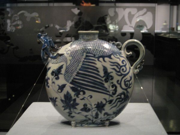 这个,是窖藏,青花凤首扁壶。打开地窖时由于内外压力不同,瓶子成了碎片,这是修复过的,对于我们这些外行来说,根本看不出修补的痕迹在哪里。凤凰的壶嘴与壶身并不在一个平面上,偏向了一侧,另外,凤凰嘴里有一颗珠子,可以自由活动,倒水时可以自然将水分作两股,也就是说,可以同时给两个杯子倒水。全中国这种壶型只有两个,另一个在新疆,只是残缺了40%以上。