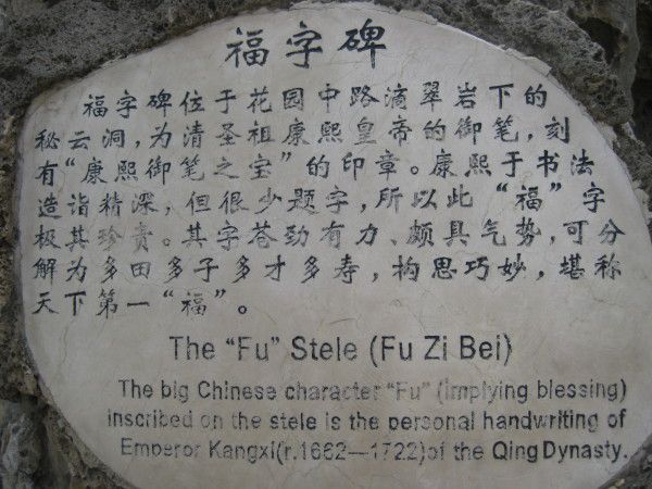 说了这么多,却没有给“福”字拍照,只是拍下山体上的这个说明。因为导游说现在“福”字被罩在玻璃罩子里,如果照相就会有反射,那么就会折福。既然听到了,摸摸就好,不然心里会怪怪的。